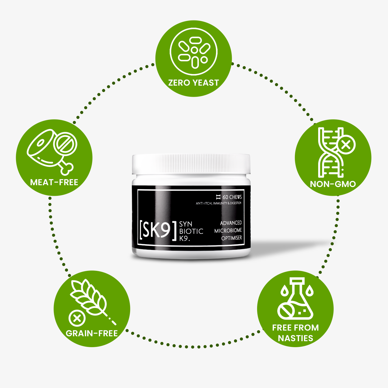SK9™ is an advanced microbiome optimiser with 12 active ingredients that targets the entire itch cycle.